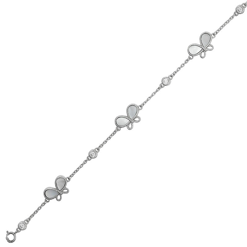 (BR591) Rhodium Plated Sterling Silver Mother Of Pearl Butterflies And CZ Bracelet